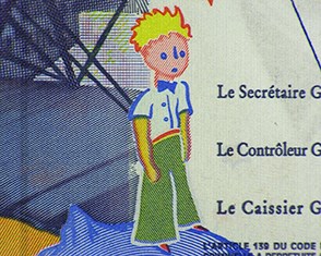 In 1992, six years before the wreckage of his plane was discovered, the Bank of France chose to honor Saint-Exupéry’s memory by printing his image on their 50 Franc note. The banknote is adorned with numerous references to the author’s life and works, most notably the image of the Little Prince. Keeping the prince company on the note are security devices cleverly disguised as other elements from his story. A green foil “hat”—really an elephant being eaten by a giant boa—can be found in the top left corner. Above this device are eight lines of microprinting which to the naked eye look like solid lines, but upon magnification they read, “Il y avait sur une étoile une planète la mienne la terre un petit prince à consoler! Je le pris dans les bras,” which is a quote from the French version of the book. Towards the bottom left is another subtle addition: a small image of a sheep that is only visible at certain angles or under UV lighting (though on several misprinted notes the sheep may be missing, doubled, or in the wrong location). As an homage to Saint-Exupéry’s love of flight, there are two planes printed on the note, a Latécoère 28 on the obverse and a Breguet 14 on the reverse, both of which were flown by Saint-Exupéry during his piloting career. The front of the note also features a map of Europe and Africa with a flight path plotted over it.