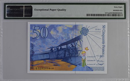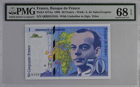 The Saint-Exupéry notes were first issued in 1992 (eventually assigned Pick number 157a) and 1993 (Pick number 157b); from 1994 to 1999, the same design was issued again, but with a slight edit that removed an extraneous acute accent from “Éxupéry,” correcting it to the proper spelling of “Exupéry” (Pick numbers 157Aa-d). Though all of these notes were pulled from circulation in December of 2001 with the introduction of the Euro in France, they are still popular collector’s items, with a grand total of 244 issued notes (across all varieties) graded at the time of writing according to the PMG Census. The highest graded examples thus far are eight notes (four 157Aa and four 157Ad) which scored 68 EPQ.