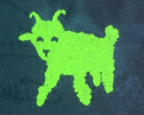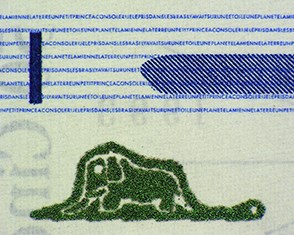 Green foil security device in the shape of a snake eating an elephant beneath eight lines of microprinting. Click image to enlarge. |